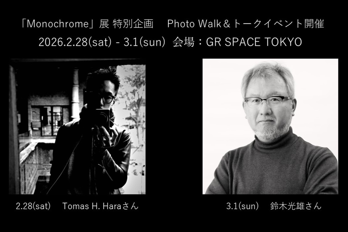 この展示に関連して、2月28日(土)と3月1日(日)に、GR IV Monochromeの製品ページやギャラリーページの作品撮影をしていただいた写真家さんをゲストに迎えて、モノクロをテーマにしたPhoto Walkとトークイベントを開催いたします。