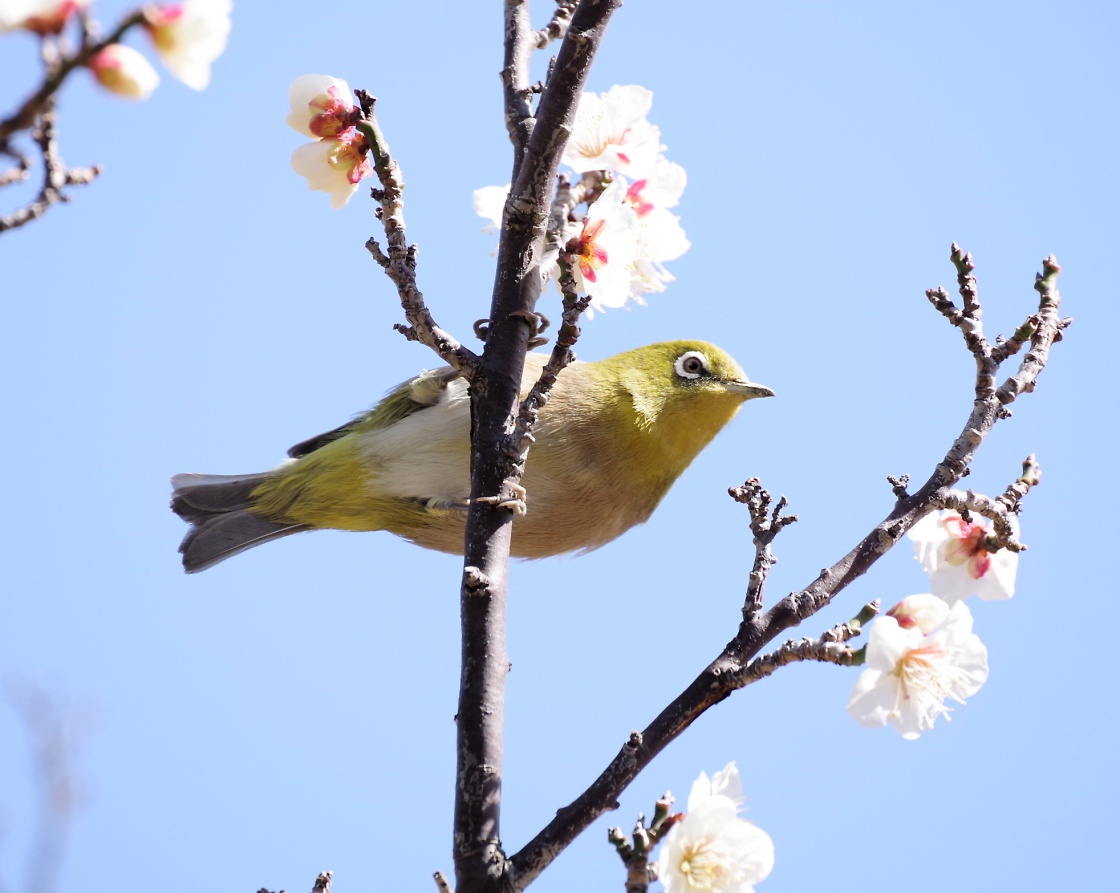 A small Japanese white-eye bird flitted among the blossoms, sipping nectar. Its yellow-green body and white ring around its eyes were so cute.